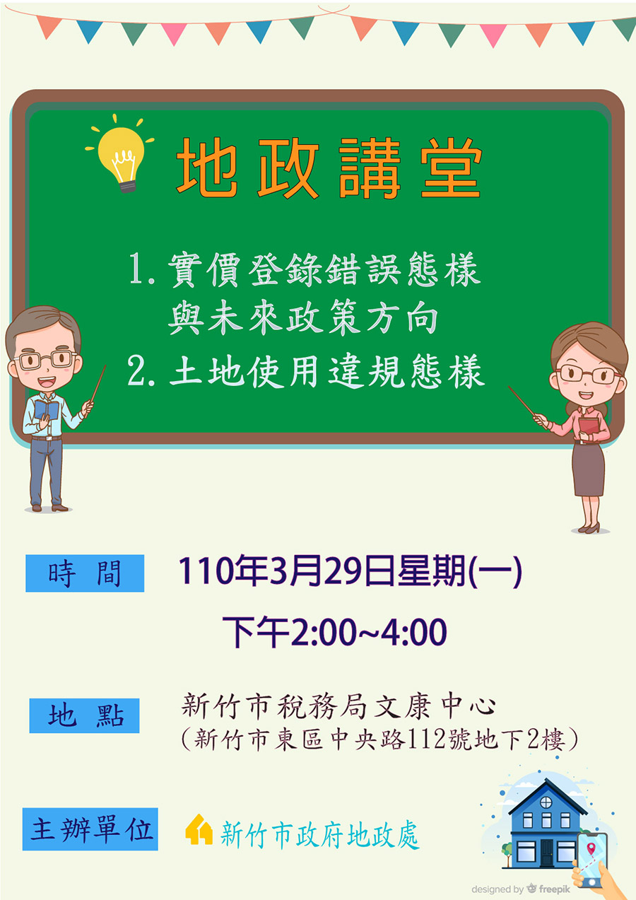 一.日期:112年7月24日(星期一) 二.時間:13:30~16:30 三.題目:112年預售屋新制解密大公開 課程內容: 13:30~14:30- 平均地權條例修法重點--新竹市政府地政處地價科曾韻蓉科長 14:30~16:30-私法人購買住宅許可登記---新竹市地政事務所登記課詹繡菊課長 五.地點新竹市政府綜合大禮堂